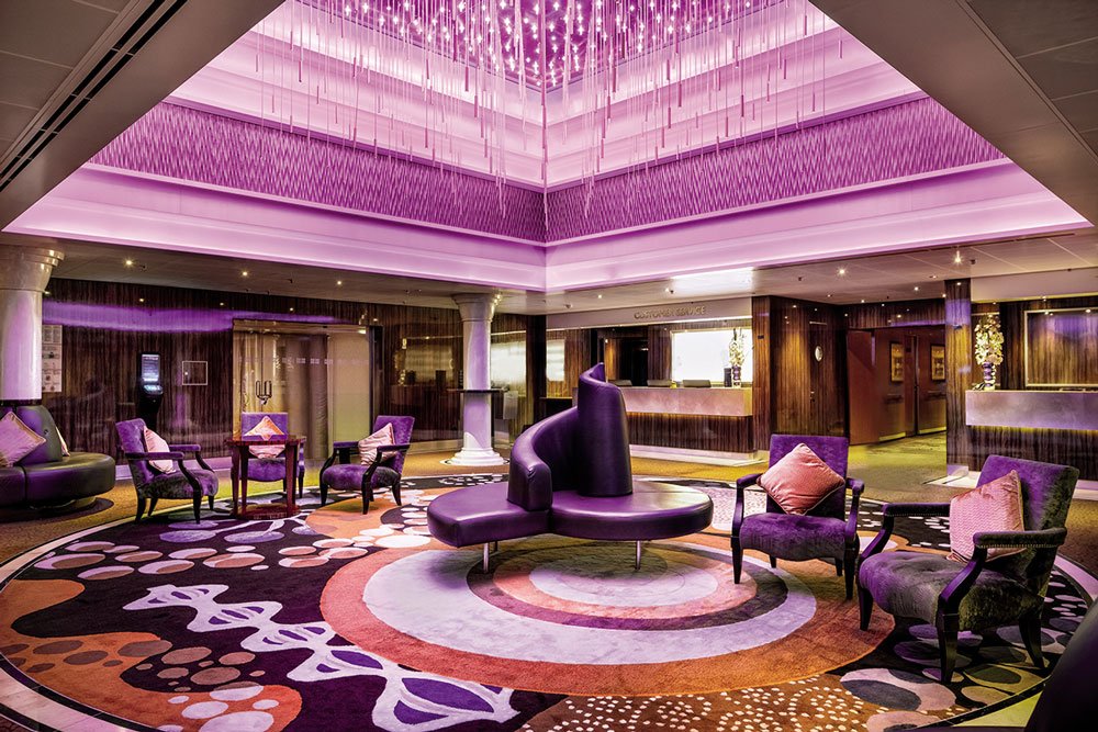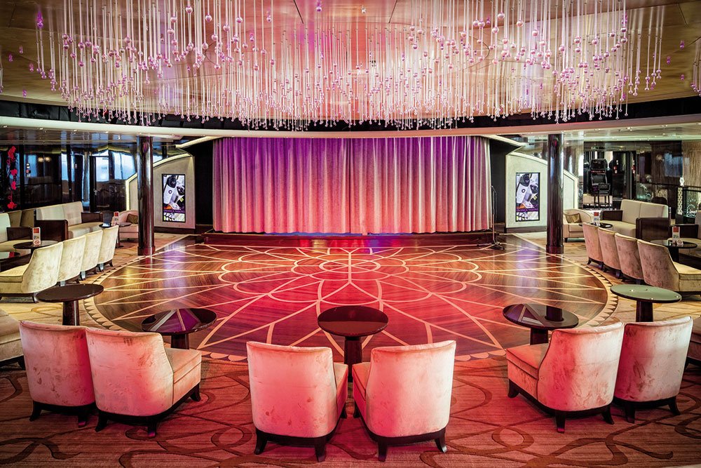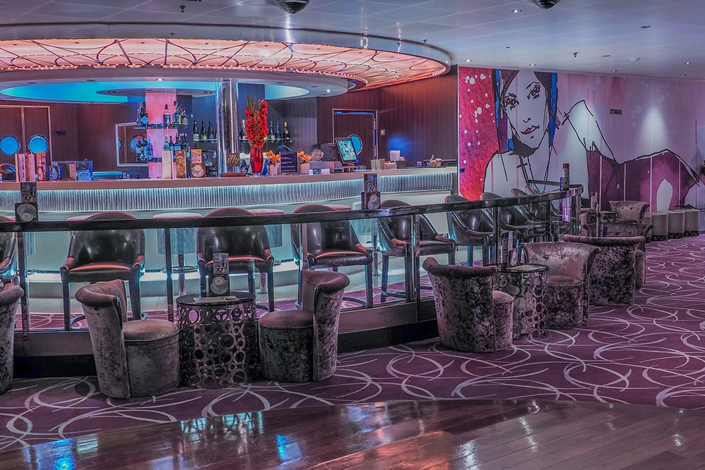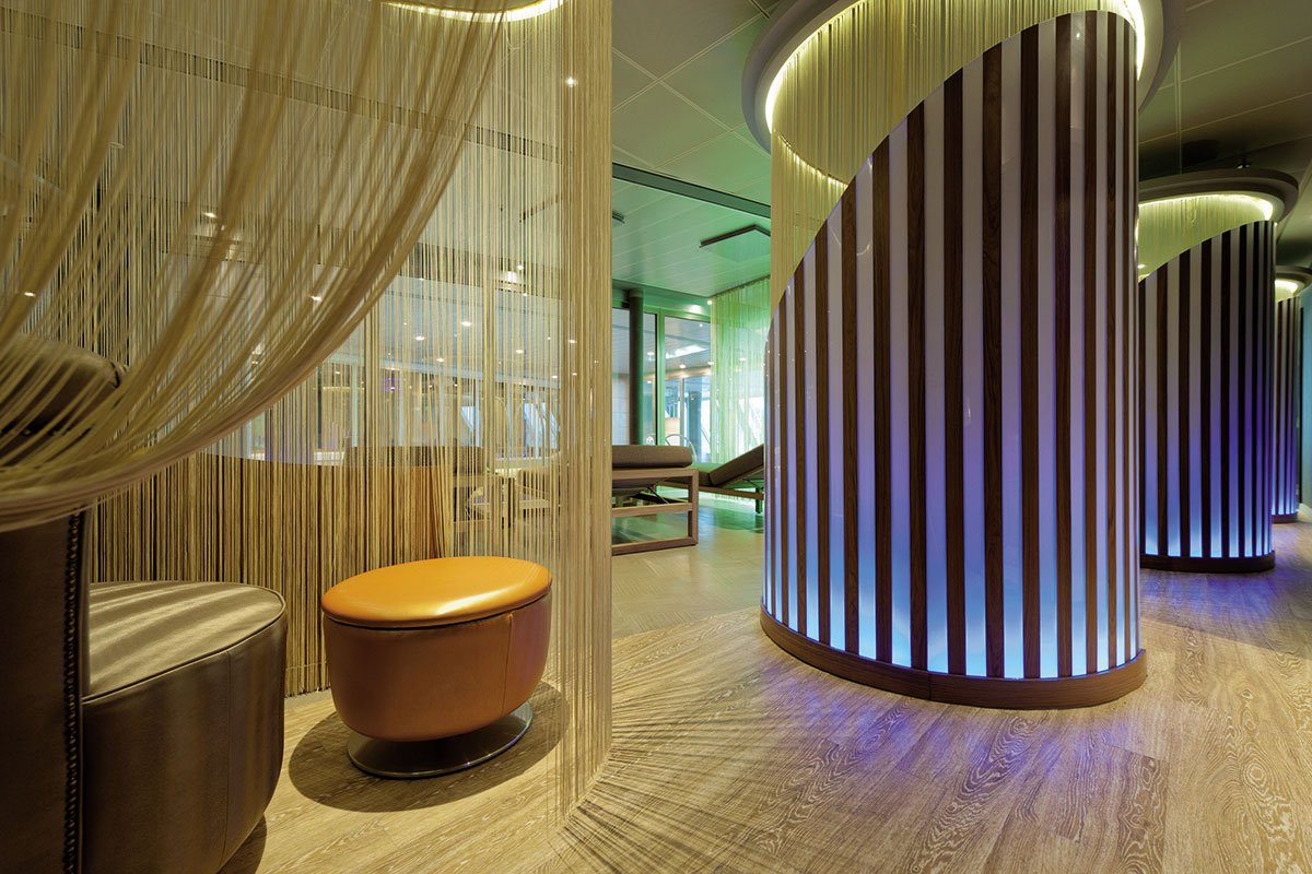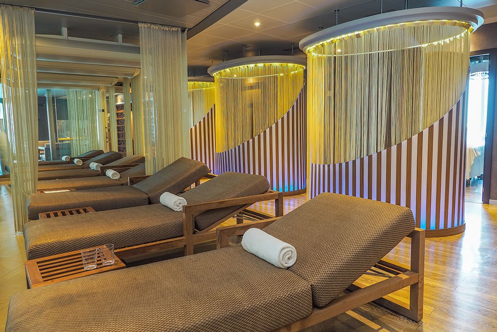 Por las noches puedes elegir pasar el tiempo en el casino o relajarte con una buena lectura en la biblioteca. Para un descanso completo de cuerpo y mente acude al spa con vistas panorámicas, aquí encuentras desde talasoterapia hasta servicio de masajes y suite termal.
