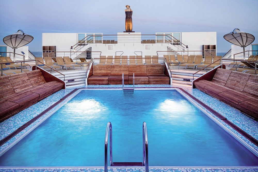 Además, entre las escalas del crucero, Santorini, Mykonos o Rodas, puedes disfrutar del moderno Beach Club. Este es un espacio exclusivo para adultos que se hospedan en la clase Suite o Wellness. Aquí podrás descansar en cómodas tumbonas o contemplar el paisaje desde un maravilloso jacuzzi.