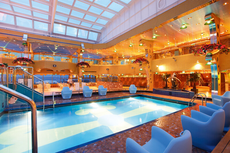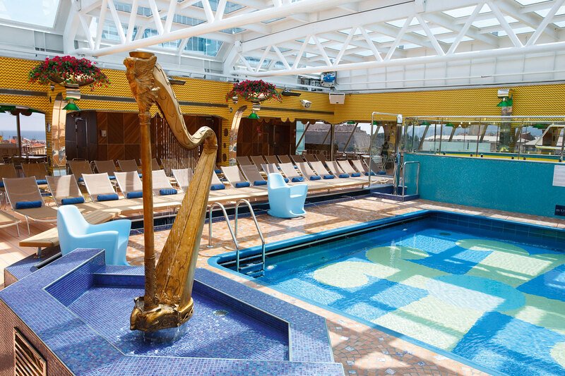 Toma un refrescante baño en las 4 piscinas del crucero. Despreocúpate si llueve o es invierno, pues una de ellas dispone de una cubierta retráctil.