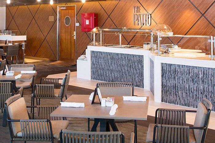 Azamara se caracteriza por presentar variedad de opciones para cada comida, motivando al pasajero a explorar la comida local mientras está a bordo, disfrutando de varios ambientes a lo largo del día, mientras que en la noche se percibe una vibra de luces más suaves.